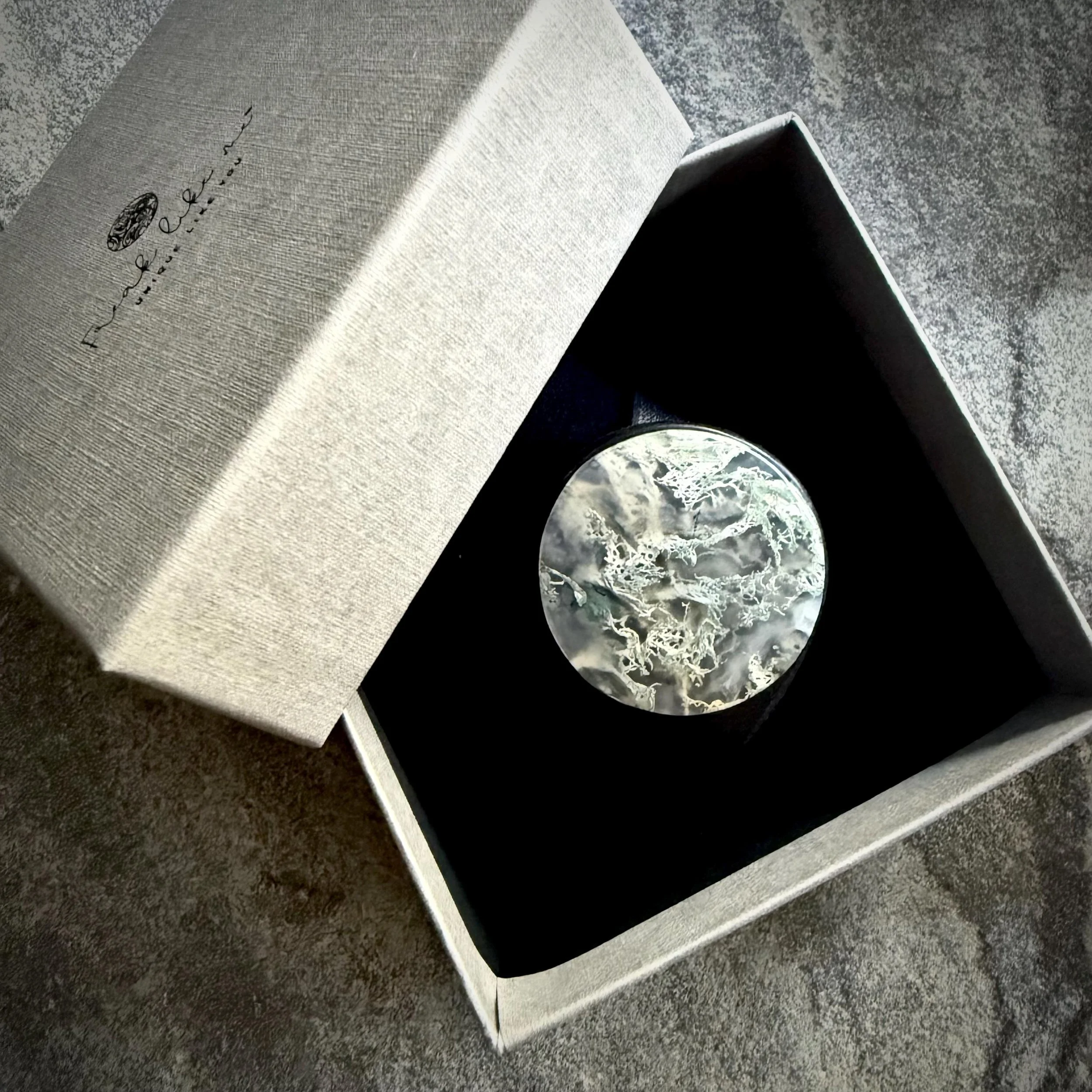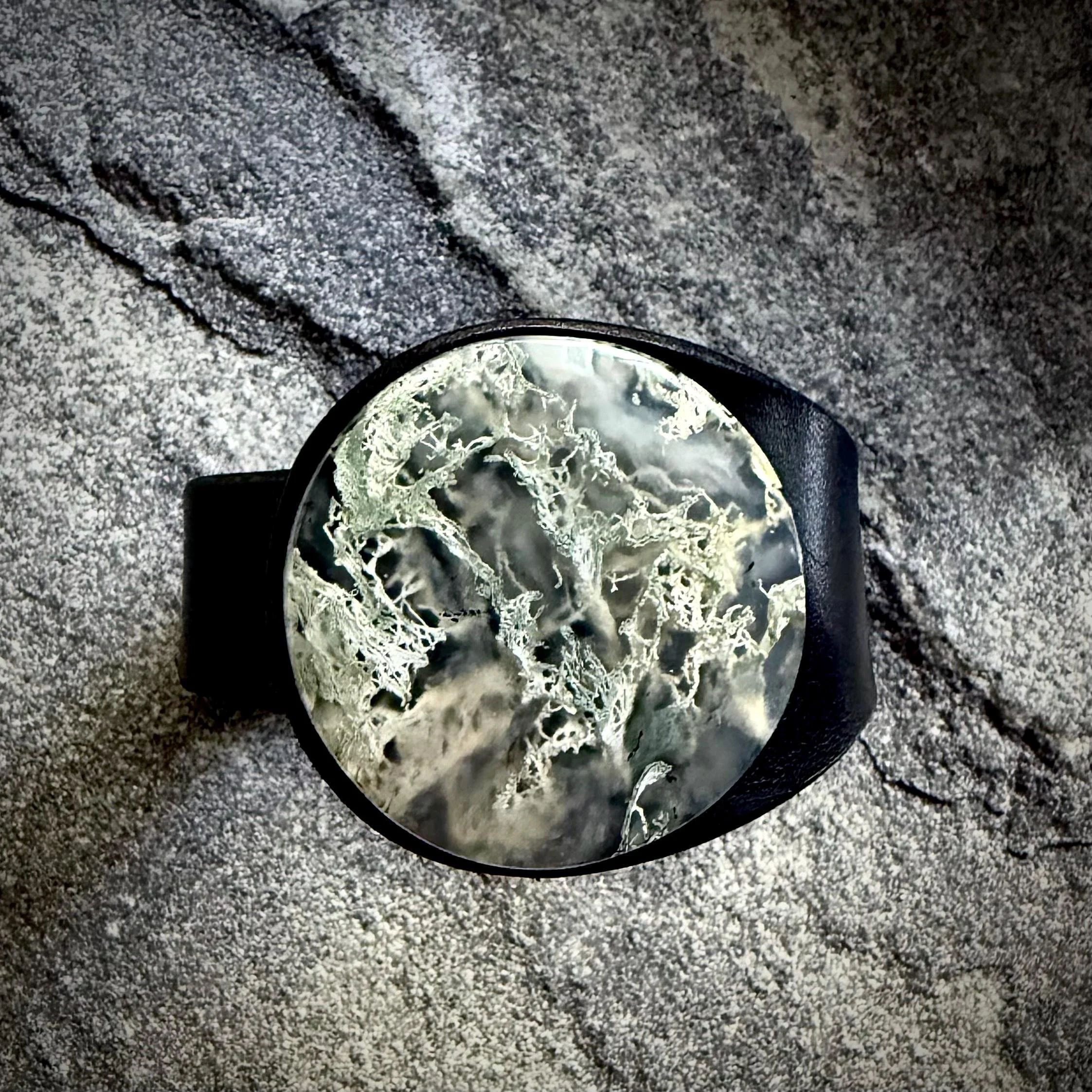 Gemstone: Natural Plume Agate sitting on top of a man-made backing, showcasing the feathery detail of the natural gemstone on top – 38mm in diameter