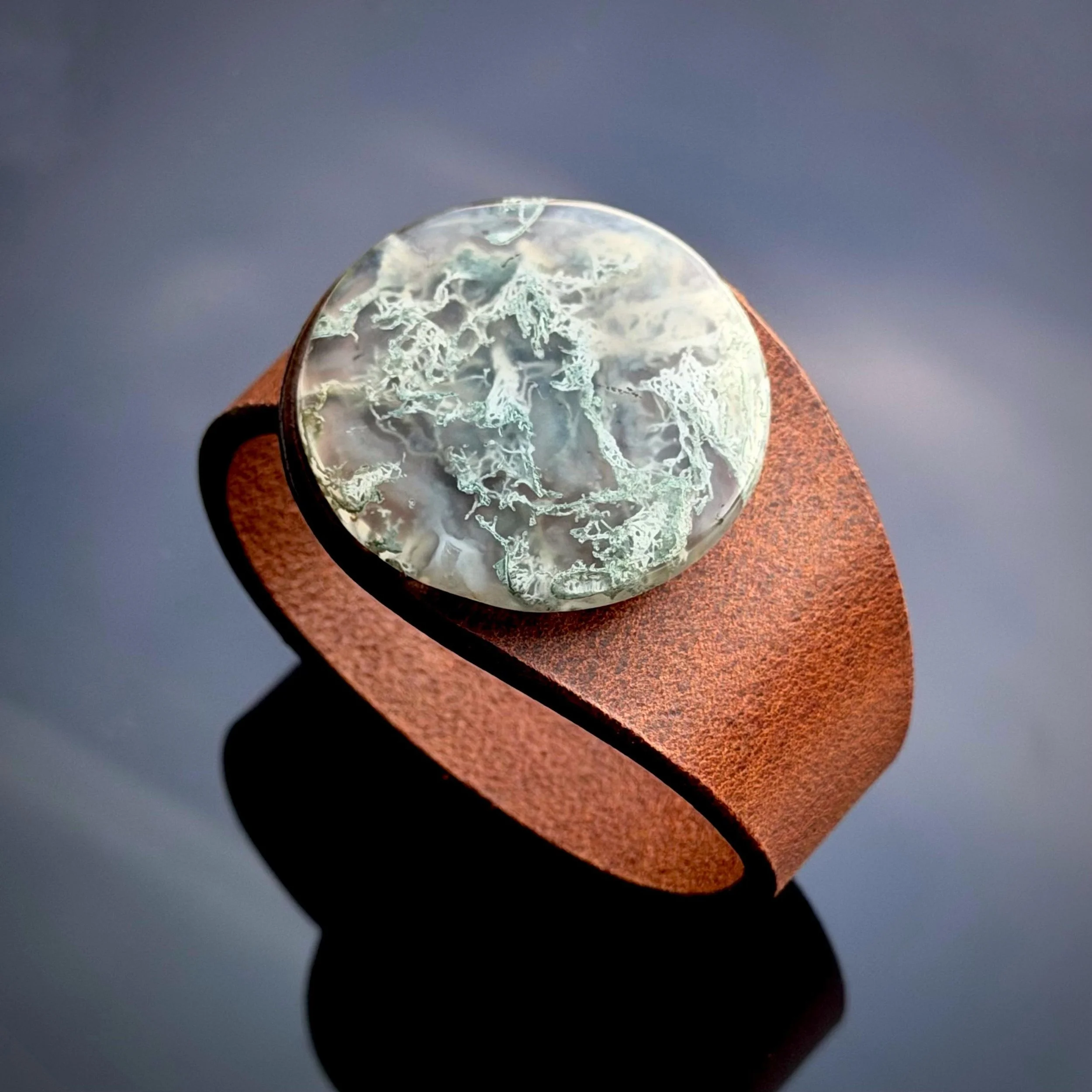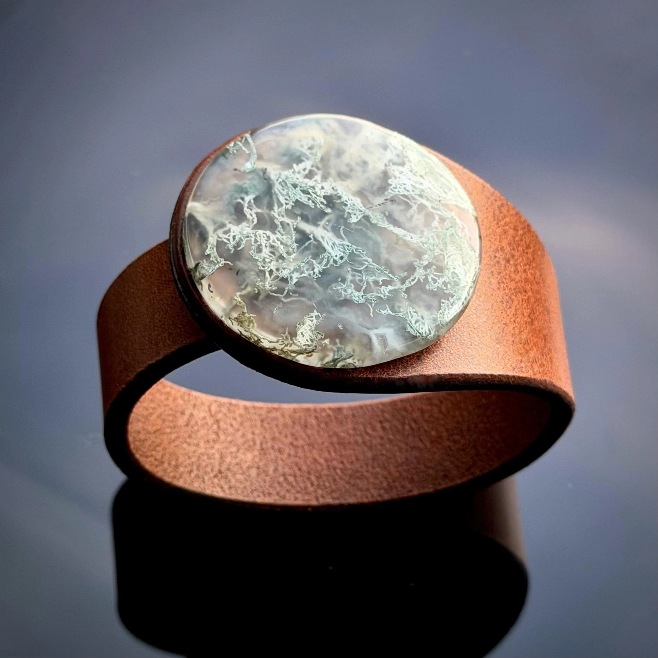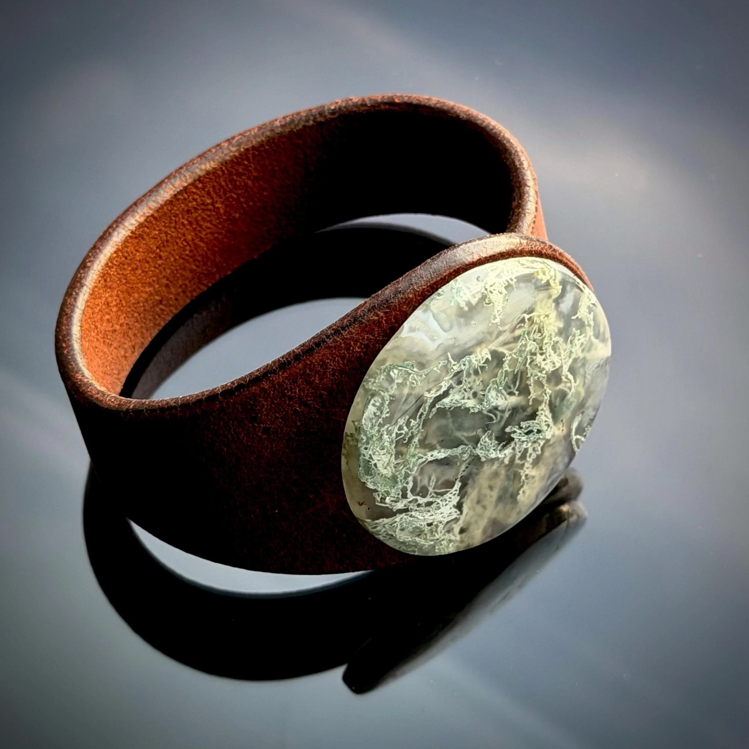 Experience the bold fusion of bohemian style and alternative fashion with this handcrafted leather and gemstone cuff - a true statement piece for your wrist. The Peacemaker - from our Plume Agate Collection - features a stunning Plume Agate doublet gemstone, top grade natural leather bracelet and hypoallergenic metal snap closure, embodying both artistic craftsmanship and contemporary fashion jewellery design.