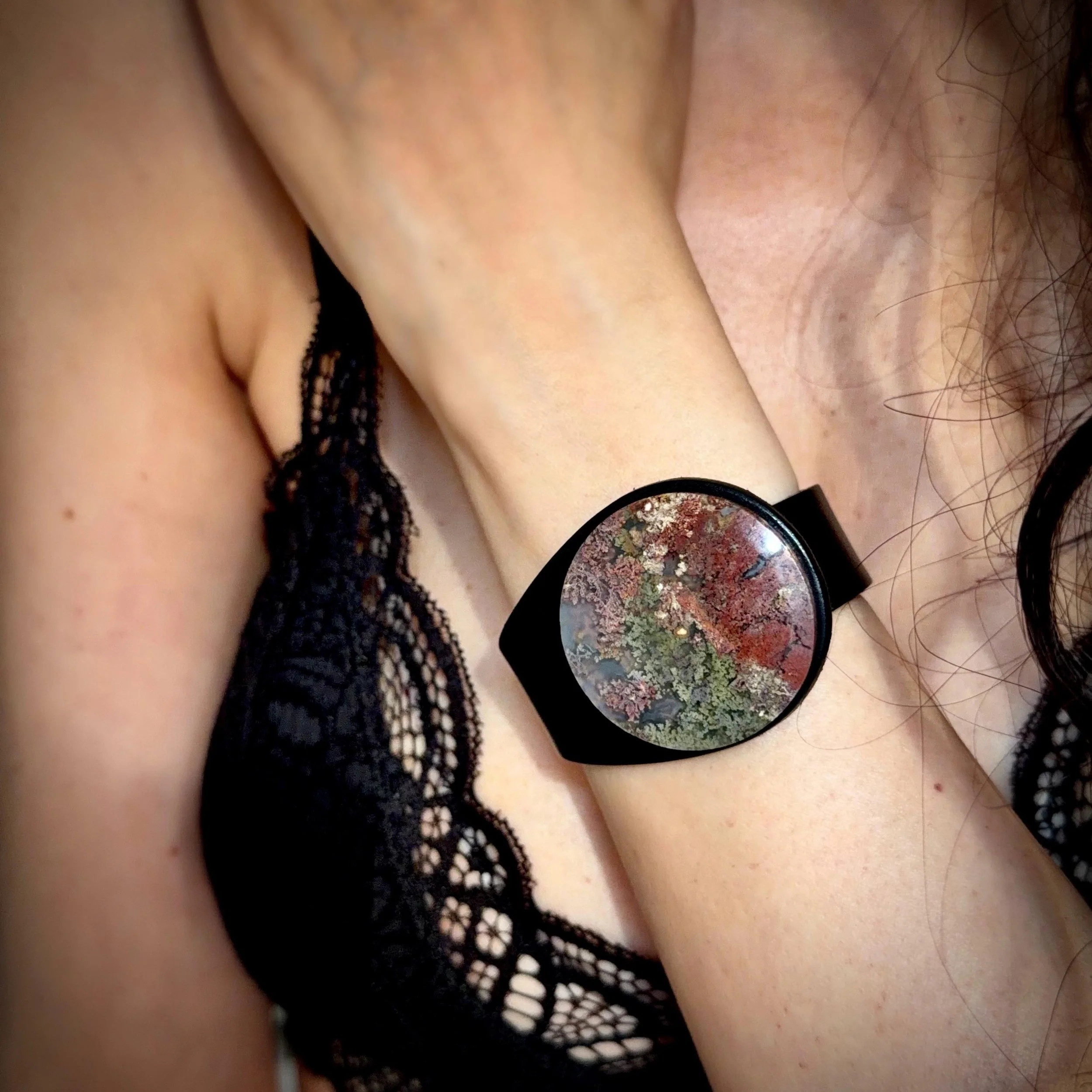 Experience the bold fusion of bohemian style and alternative fashion with this handcrafted leather and gemstone cuff - a true statement piece for your wrist. The Peacemaker - from our Plume Agate Collection - features a stunning Plume Agate doublet gemstone, top grade natural leather bracelet and hypoallergenic metal snap closure, embodying both artistic craftsmanship and contemporary fashion jewellery design.