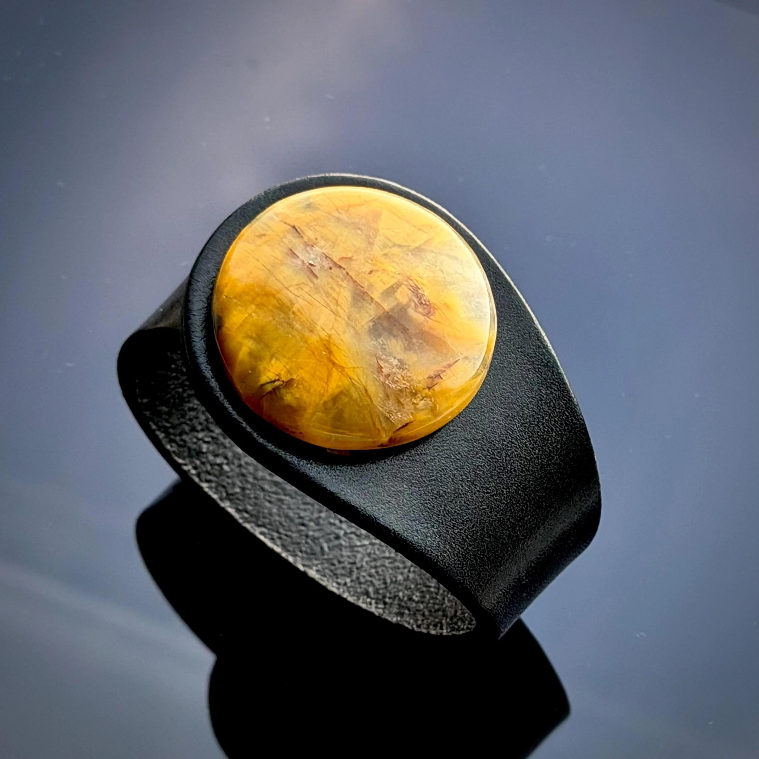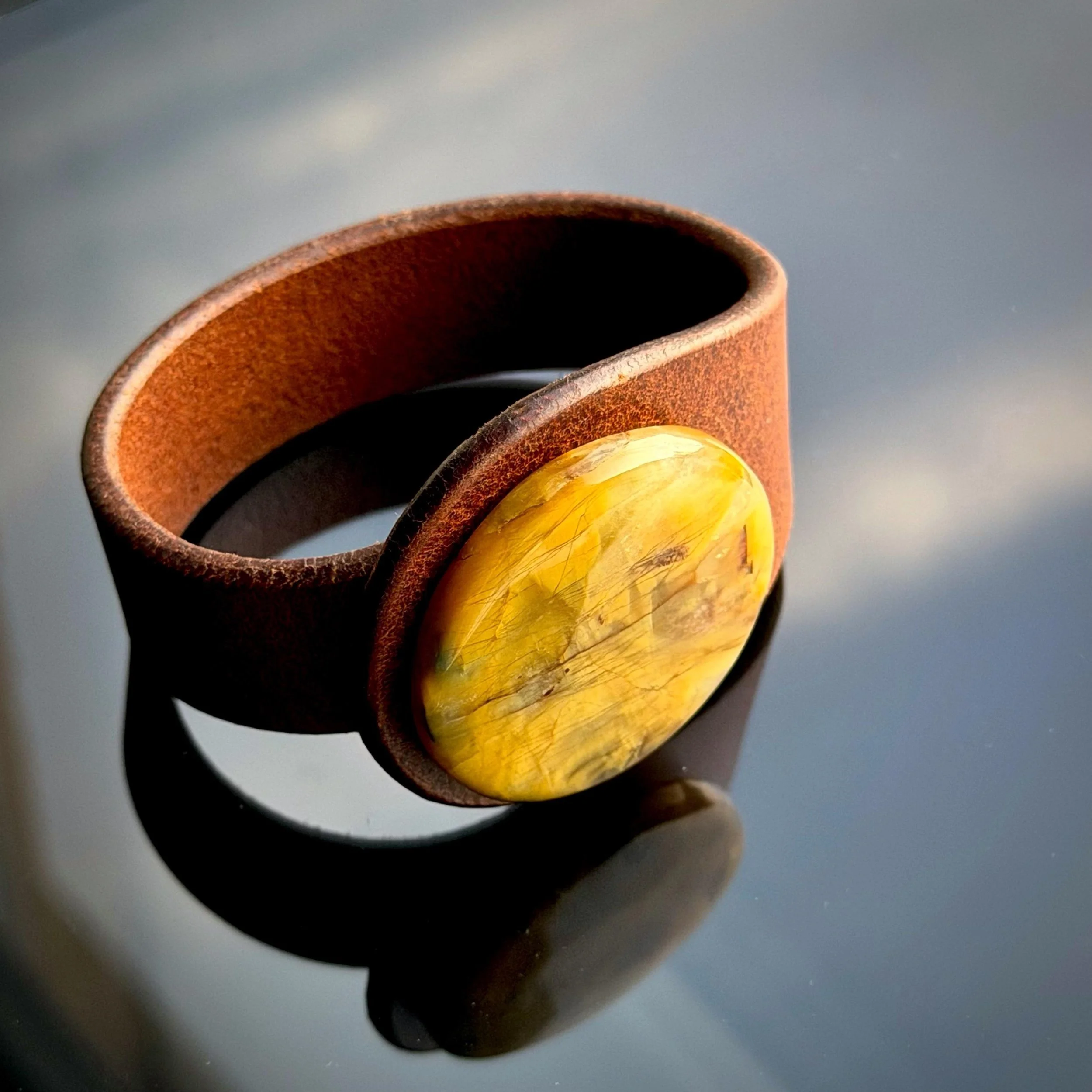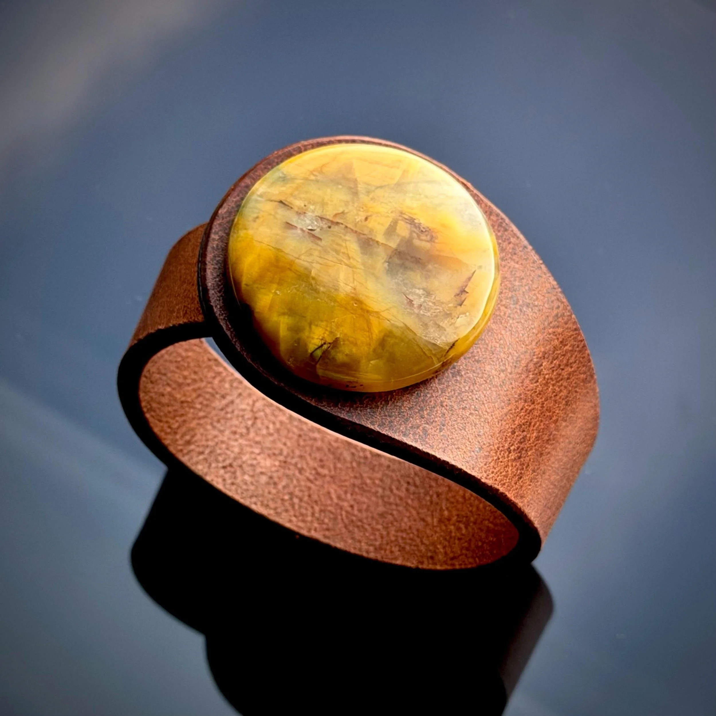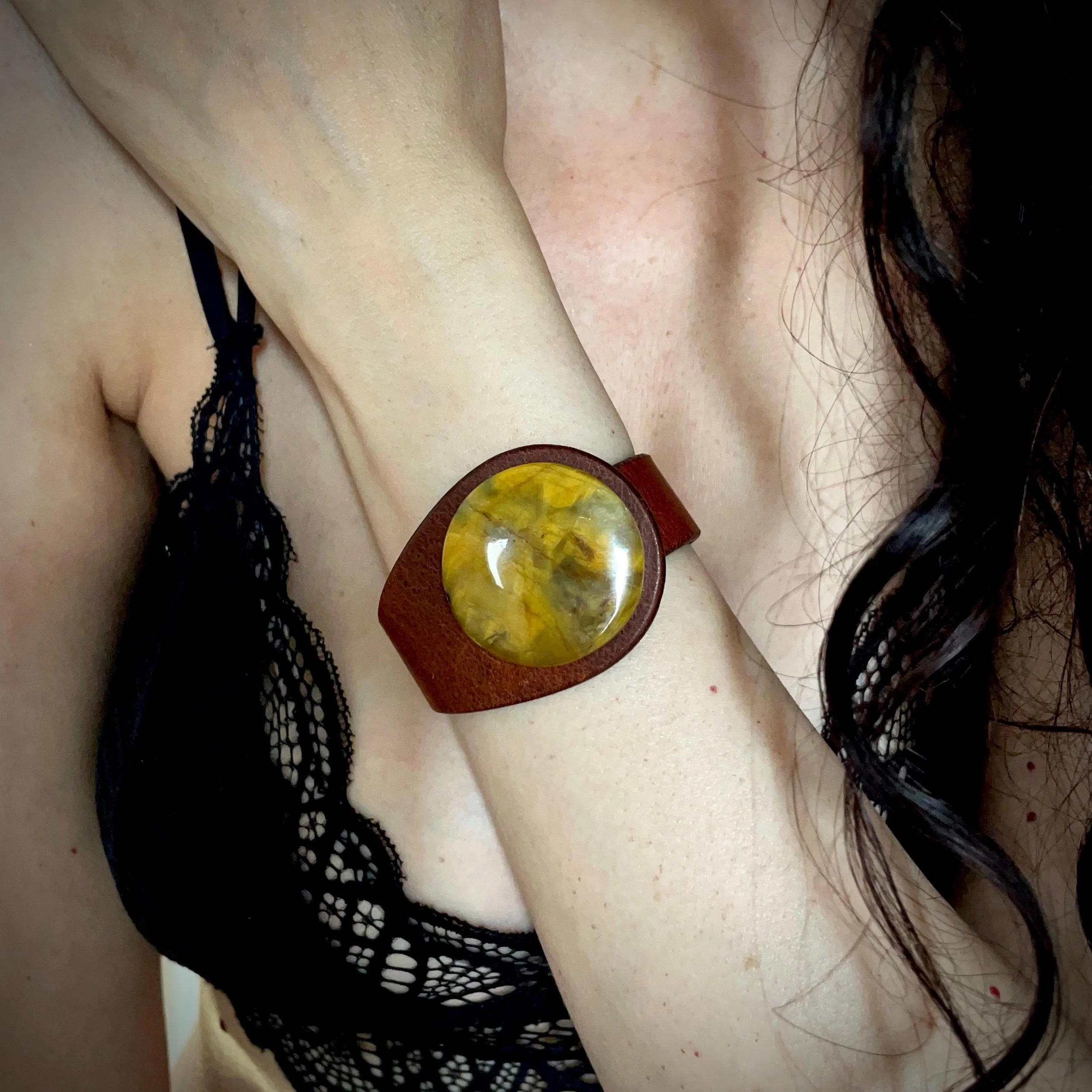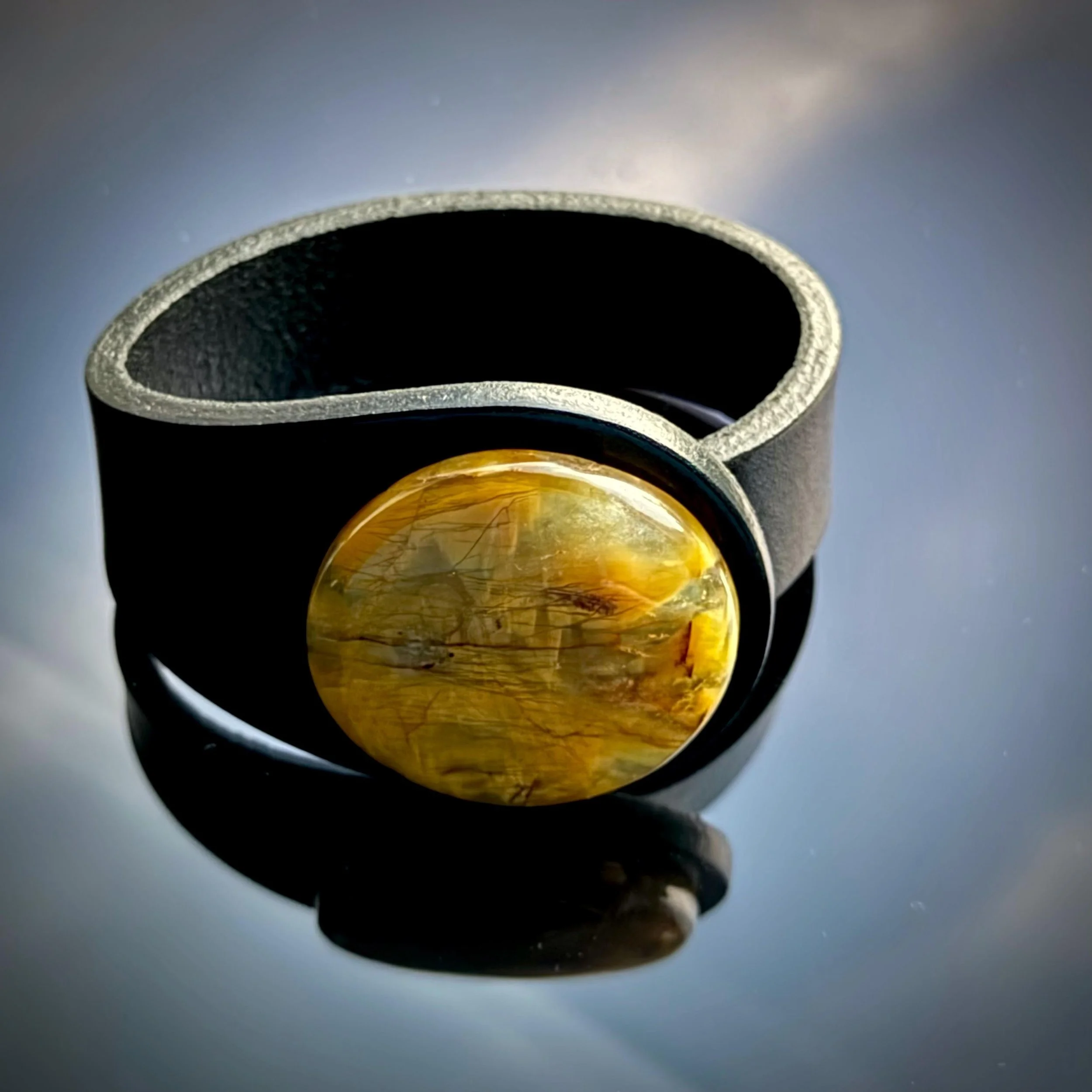 Experience the bold fusion of bohemian style and alternative fashion with this handcrafted leather and gemstone cuff - a true statement piece for your wrist. The Peacemaker - from our Plume Agate Collection - features a stunning Plume Agate doublet gemstone, top grade natural leather bracelet and hypoallergenic metal snap closure, embodying both artistic craftsmanship and contemporary fashion jewellery design.