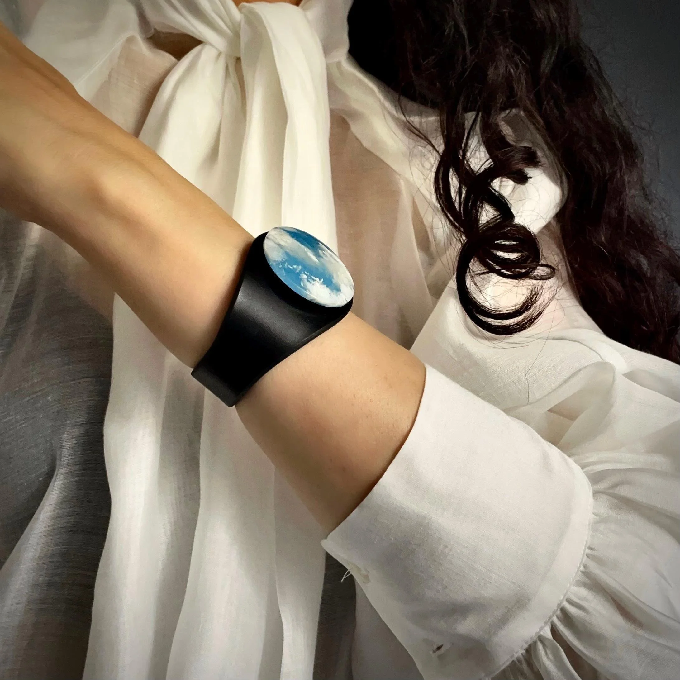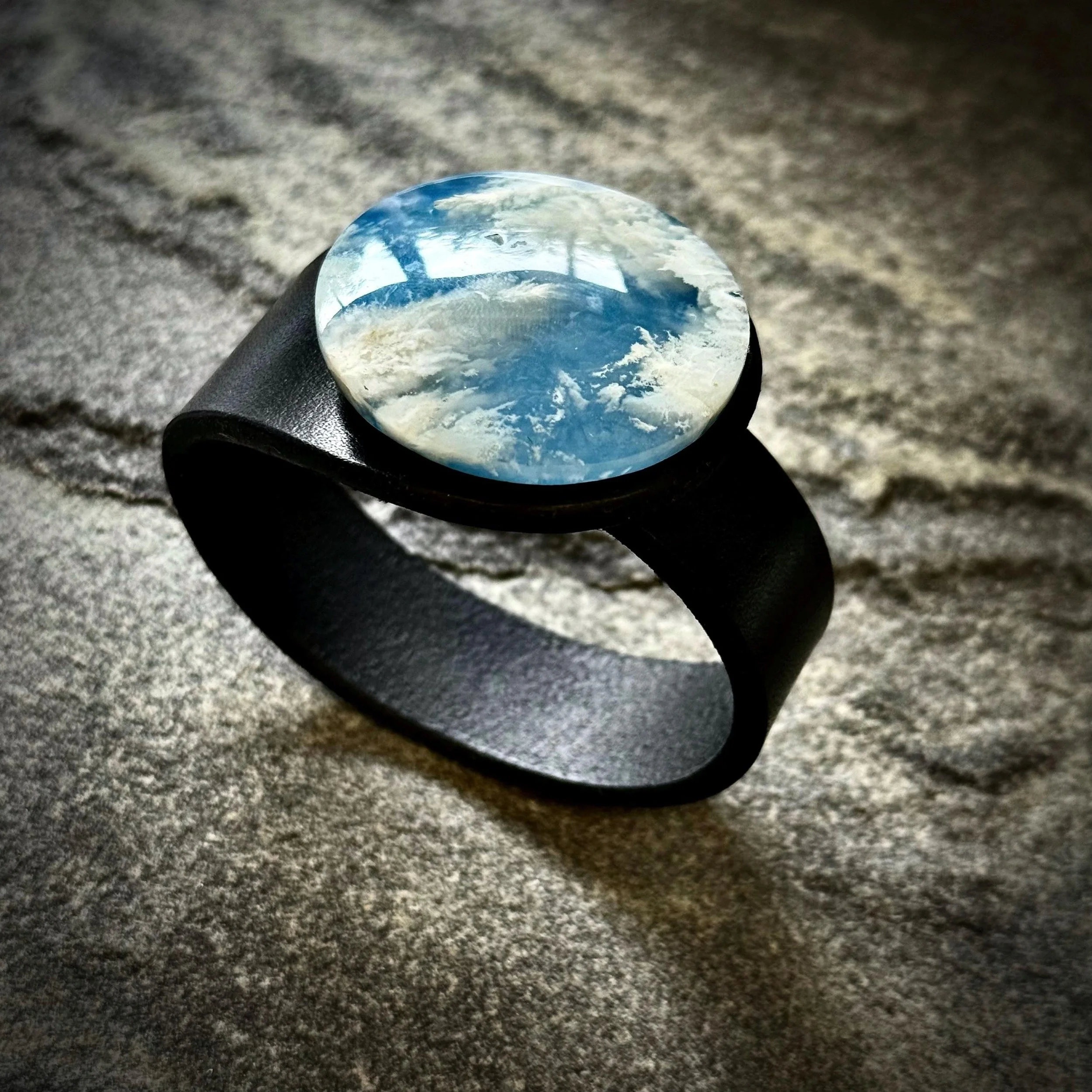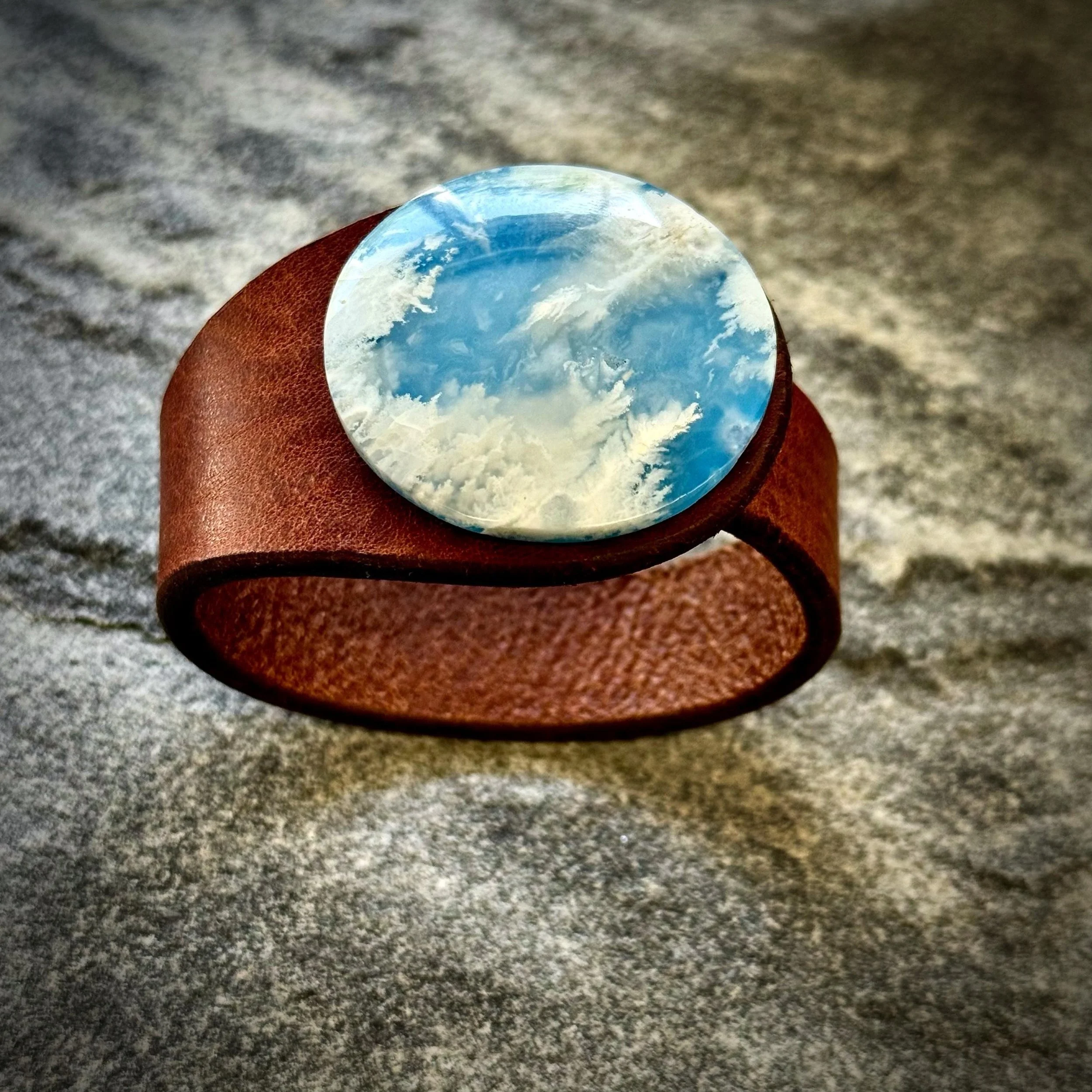 Experience the bold fusion of bohemian style and alternative fashion with this handcrafted leather and gemstone cuff - a true statement piece for your wrist. The Peacemaker - from our Plume Agate Collection - features a stunning Plume Agate doublet gemstone, top grade natural leather bracelet and hypoallergenic metal snap closure, embodying both artistic craftsmanship and contemporary fashion jewellery design.